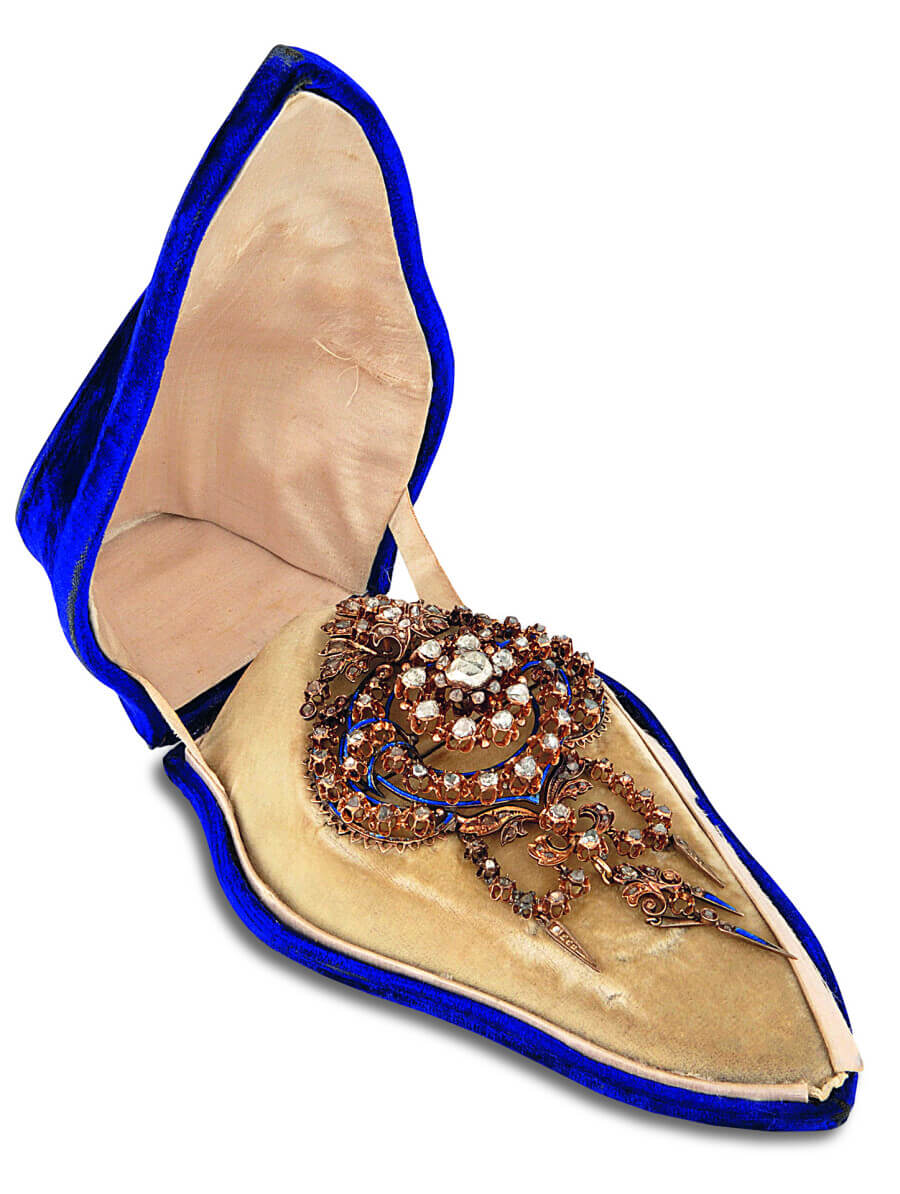 Broş. Altın, elmas, mine, kompozit, kristal dö roş (ince taşlar). Kalınlık 2.3 cm, genişlik 6 cm, uzunluk 10,6 cm; ağırlık 0,038 kg. Fotoğraf Musée du Louvre