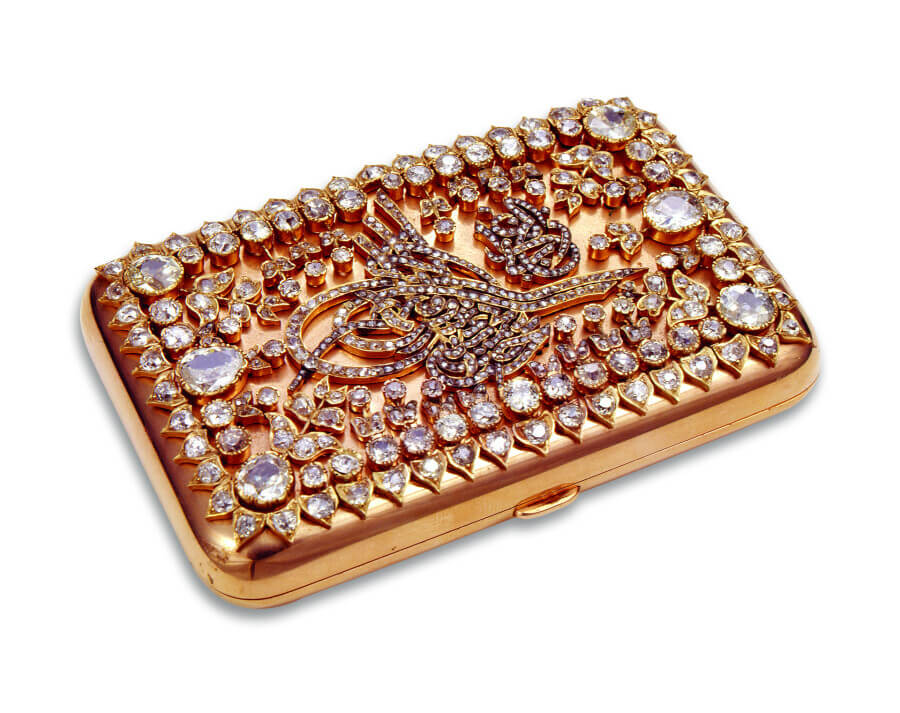 Elmaslı altın sigara kutusu (tabaka). 18 ayar altın, 204 gr. 8,5 x 11 cm. Fotoğraf Teoman