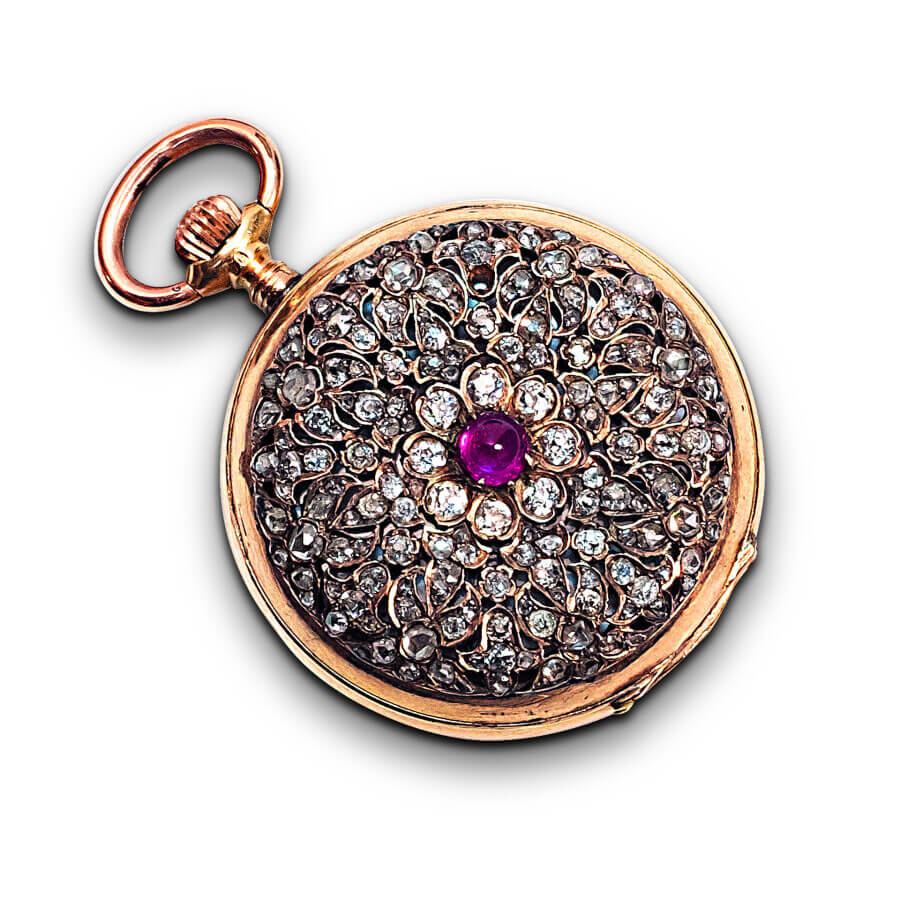 Osmanlı mücevher işçiliğinin nadir bulunur örneklerinden bir altın saat. Çap 3,5 cm. II. Abdülhamid dönemi saray başkuyumcuları Garabed Babayan ve Kapamaciyan Kardeşler yapımı