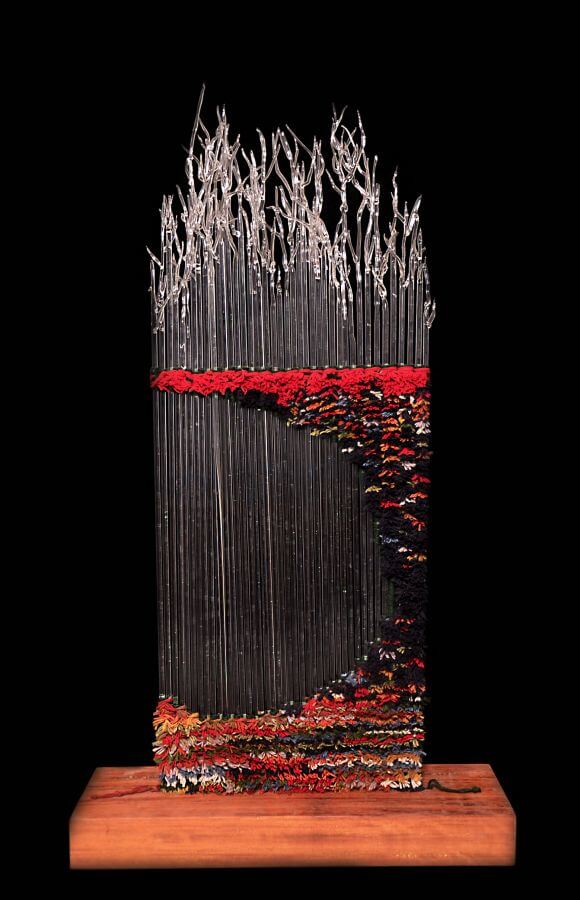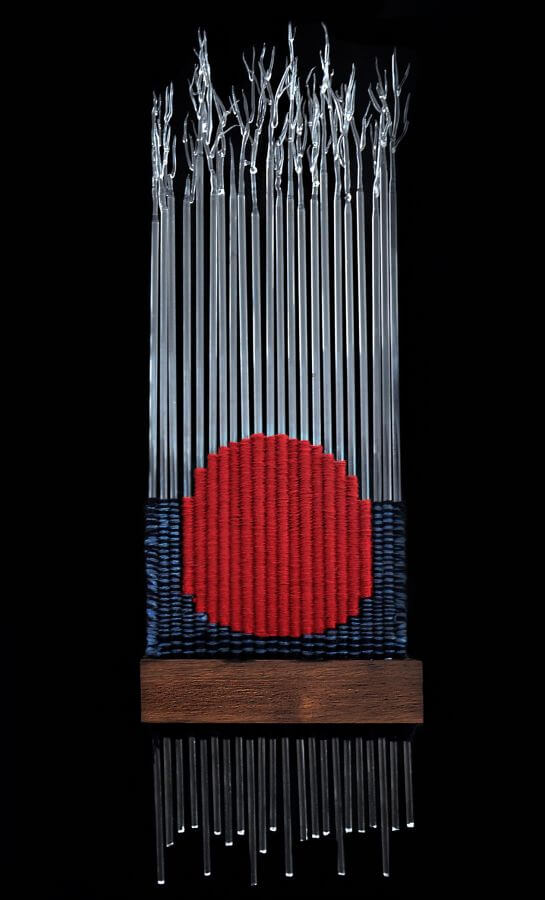 P.L. : Cam, çalışmak için oldukça zor ve şekillendirirken fırınlama, tavlama, ergitme ve boyamam gibi farklı süreçleri gerektiren bir malzeme. Bu malzemeyle eser üretmek için fizik, matematik ve hatta kimya kuralarını göz önünde bulundurmak gerekiyor. Uygulamaya geçmeden, problemlerle karşılaşmamak için eskiz süreci uzun tutulmalı. Gerekli durumlarda maket yapılması uygulama sırasında karşınıza çıkacak birçok problemin erkenden fark edilmesini sağlıyor. Genellikle tek bir teknikle çalışmıyorum. Yapacağım çalışmaya göre uygun tekniği seçip bazen kalıpta şekillendirme bazen sıcak cam üfleme bazen açık alevde camı ergitme gibi çeşitli tekniklerle çalışabiliyorum. Cam güzel ve heyecan verici bir malzeme. Türlü zıtlıklar içeriyor. Saydam ya da mat olabiliyor, kırılgan ya da masif durabiliyor, katı ya da akıcı görünebiliyor. Bunların yanında geçirgenliği ve yansıtıcılığı da başlı başına görsel bir zenginlik yaşatıyor. Bu özellikleri vurgulamayı çok seviyorum ve bunları öne çıkarmak adına ahşap, metal, ip hatta yağlı boya gibi farklı malzemelerden yardım alıyorum ve eserlerimde bu çağdaş bir görüntü sağlayabiliyor.