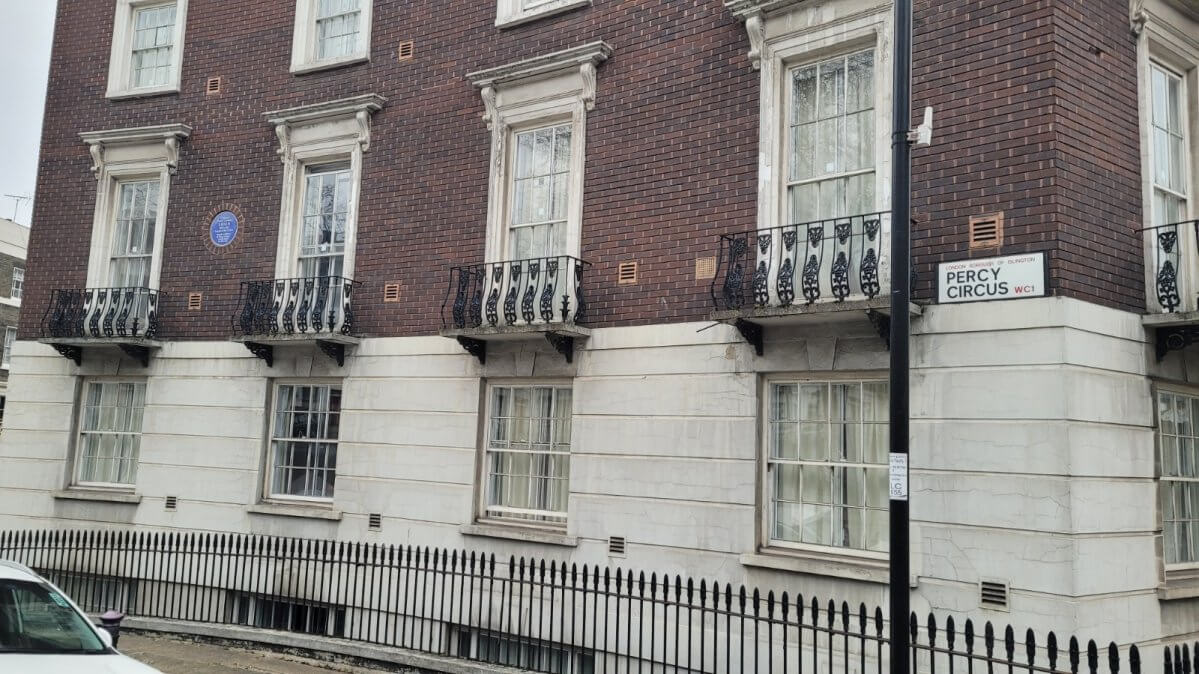 Lenin -öğrenebildiğim kadarıyla- 1905 ve 1908 yıllarında olmak üzere iki kez gelmiş Londra’ya. 1905 yılında kaldığı King Cross’ta “16 Percy Circus” adresindeki beş katlı binanın üzerindeki mavi plakette “Vladimir Ilyich Ulyanov LENIN 1870-1924 S.S.C.B.’nin kurucusu 1905’te, bu alanda bulunan 16 Percy Circus adresinde konakladı” yazıyor. Bu ifadeden de anlaşılacağı üzere (Marx’ın ikinci evi gibi) Lenin’in yaşadığı ev de yıkılmış, yerine bugünkü bina yapılmış.