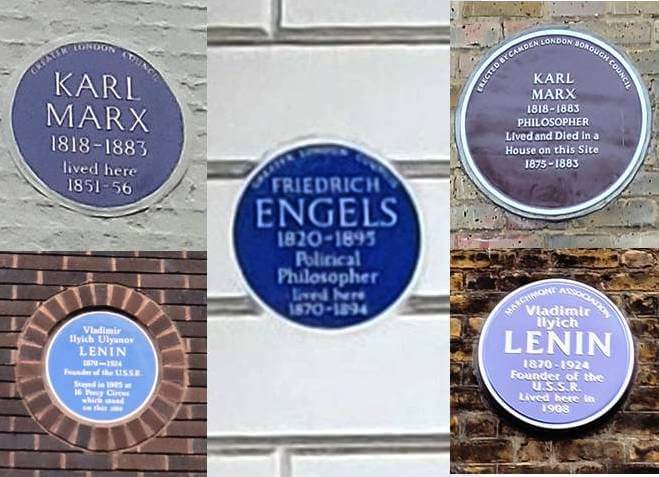 Son iki gezimde gördüğüm kadarıyla Londra’da ikisi Marx’a, biri Engels’e ve ikisi de Lenin’e ait olmak üzere üç büyüklere ait beş mavi plaka mevcut Londra’da.